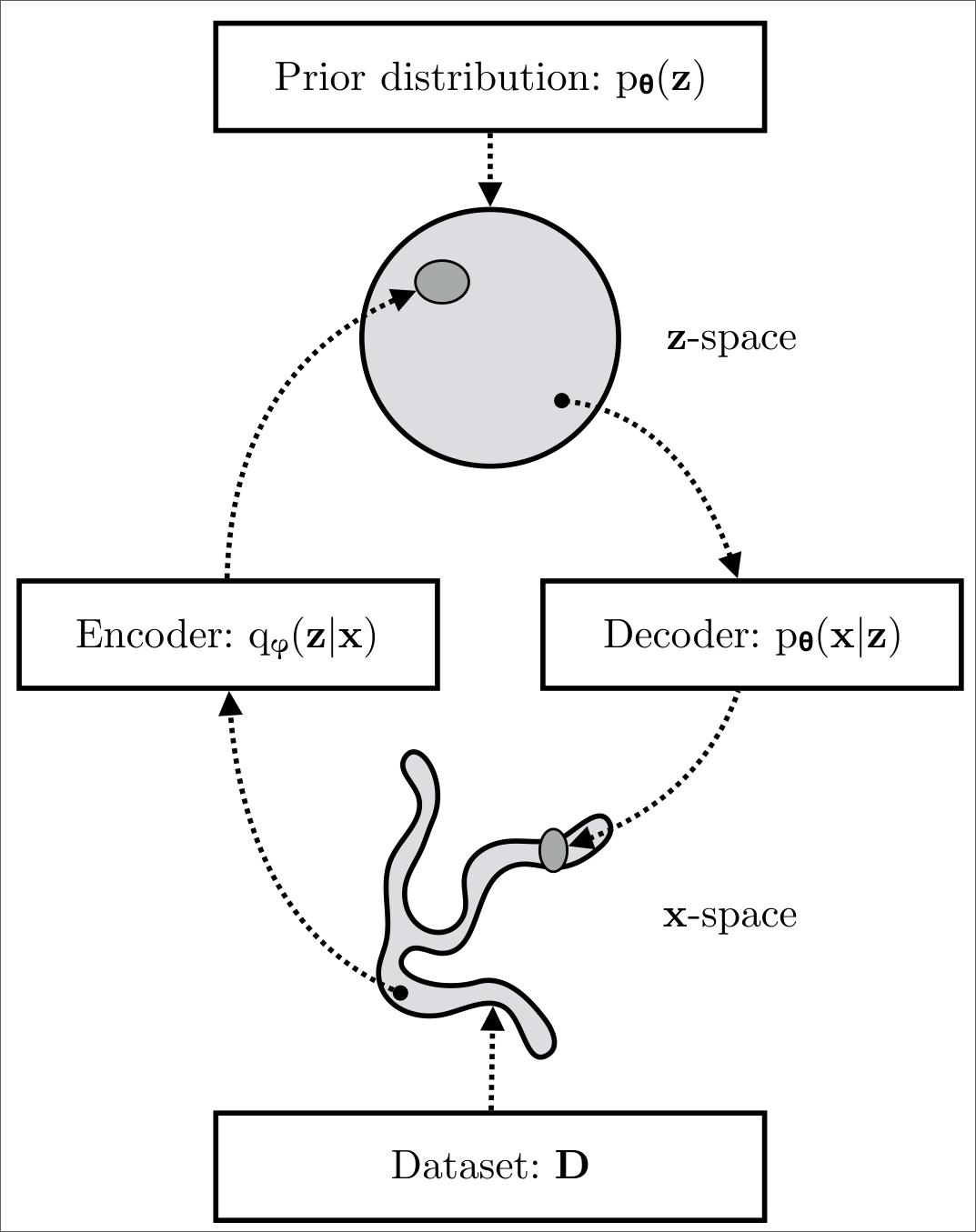 Let us introduce a parametric inference model \(q(\bm{z} \mid \bm{x}, \bm{\phi})\).