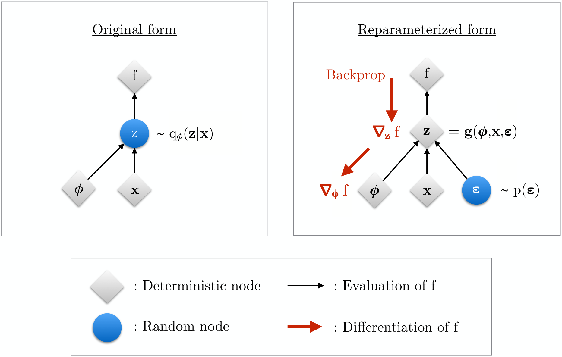 - Now, the expectations can be rewritten in terms of \(\bm{\varepsilon}\): \[ \E_{q_\phi(\bm{z} \mid \bm{x})}[f(\bm{z})] = \E_{p(\bm{\varepsilon})}[f(\bm{z})]. \]