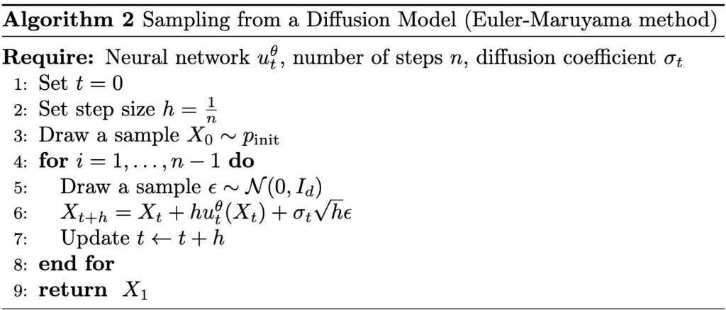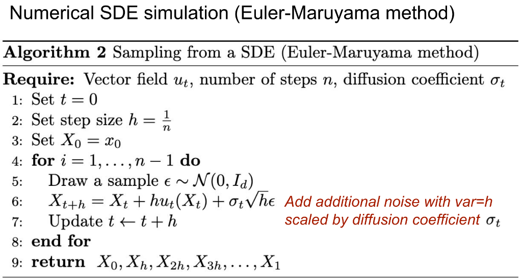 \[ x_{t+h} = x_t + h u_t(x_t) + \sqrt{h} \sigma_t \epsilon_t, \quad \epsilon_t \sim \mathcal{N}(0, I_d) \]