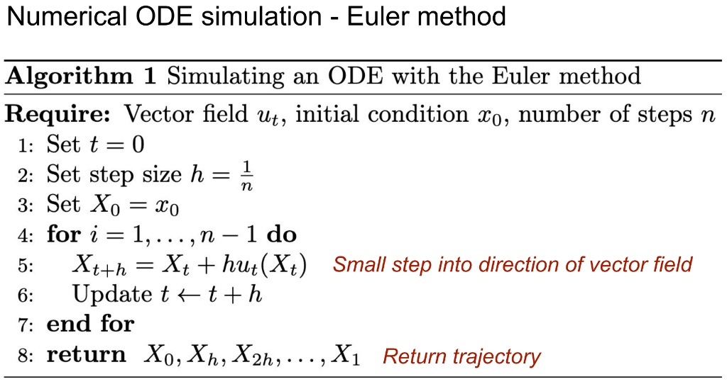 \[\underbrace{\mathrm{d}X_t = u_t^{\theta}(X_t)\mathrm{d}t}_{\color{#a30000}{\small\textit{Follow along the vector field}}}\]