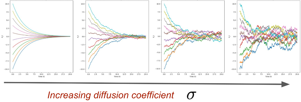 The \(\sigma_t\) in the above equation is called the diffusion coefficient and controls the amount of randomness (the ODE term \(u_t(X_t)\) is also called the drift coefficient).