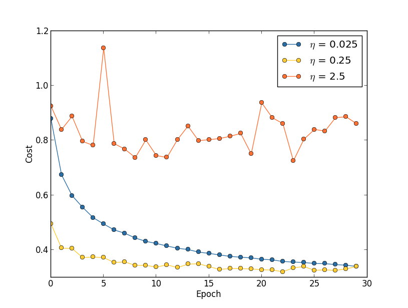- For example, try \(\eta = 0.01\). If the cost decreases during the first few epochs, then successively try \(\eta = 0.1\), \(\eta = 1.0\), \(\ldots\)