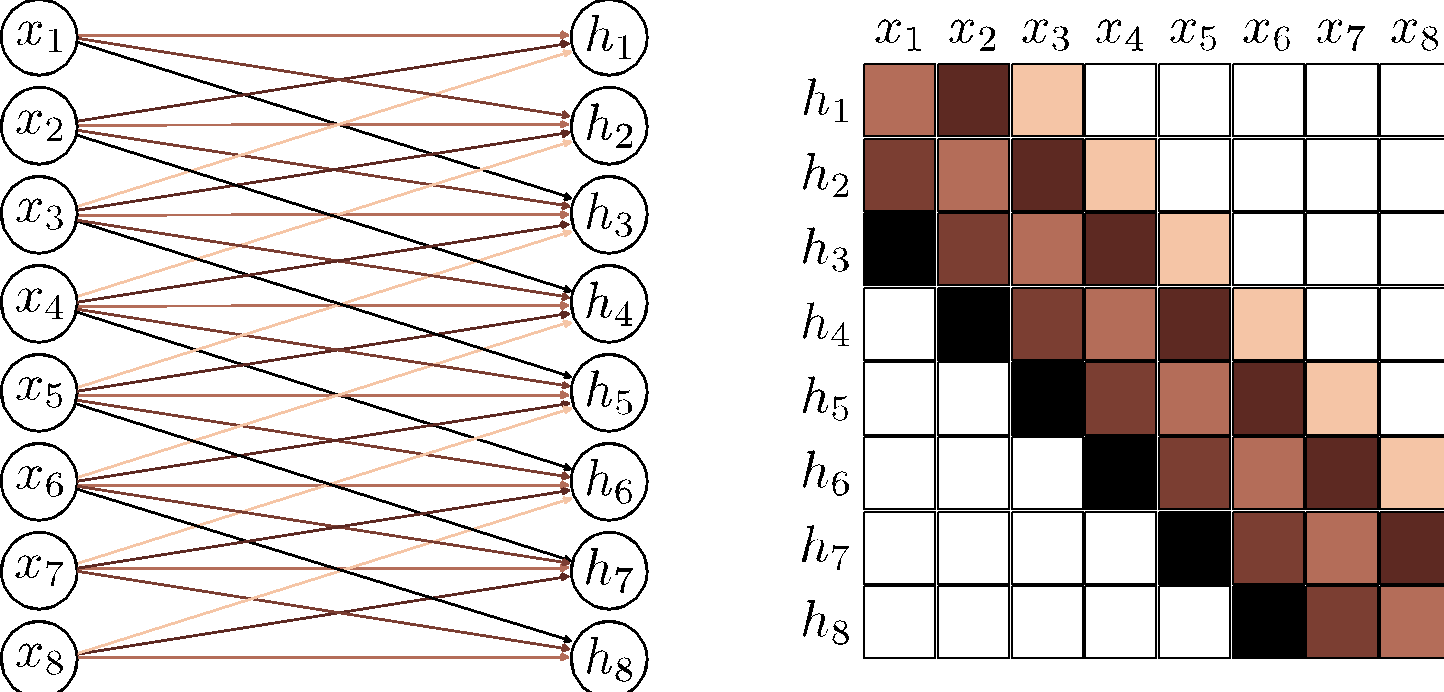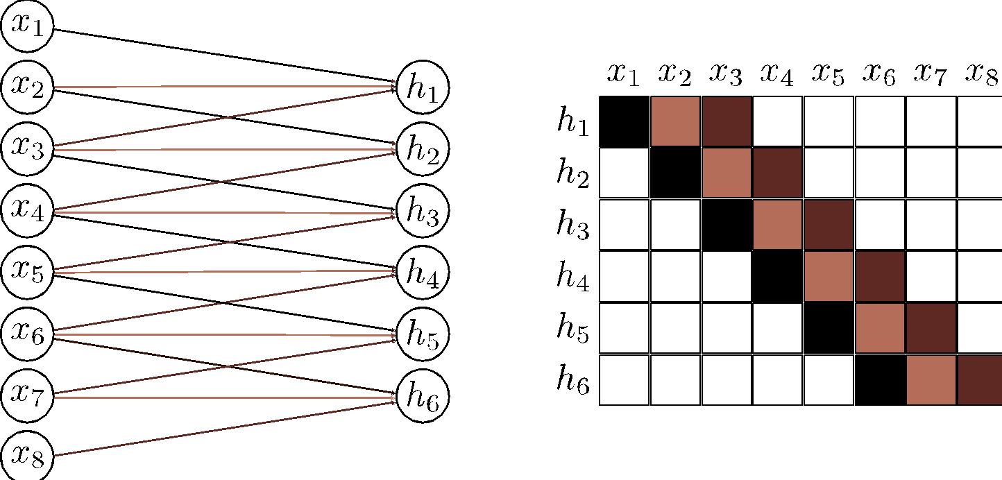 \[ \begin{aligned} \begin{split} h_i &= \sigma(\beta + \omega_1 x_{i-1} + \omega_2 x_i + \omega_3 x_{i+1}) \\ &= \sigma\left( \beta + \sum_{j=1}^3 \omega_j x_{i+j-2} \right) \end{split} &\quad {\color{DodgerBlue} \class{thick-arrow}{\xleftarrow{\hspace{1cm}}}} \quad \text{3 weights, 1 bias} \end{aligned} \]