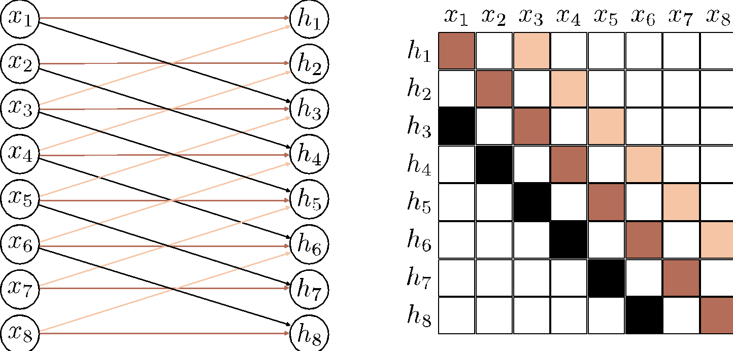 a) A fully connected layer has a weight connecting each input \(x\) to each hidden unit \(h\) (colored arrows) and a bias for each hidden unit (not shown). b) Hence, the associated weight matrix \(\bm{\Omega}\) has 36 weights relating the six inputs to the six hidden units. c) A convolutional layer with kernel size three computes each hidden unit as the same weighted sum of the three neighboring inputs (arrows) plus a bias (not shown). d) The weight matrix is a special case of the fully connected matrix where many weights are zero and others are repeated (same colors indicate same value, white indicates zero weight). e) A convolutional layer with kernel size three and stride two computes a weighted sum at every other position. f) This is also a special case of a fully connected network with a different sparse weight structure.
